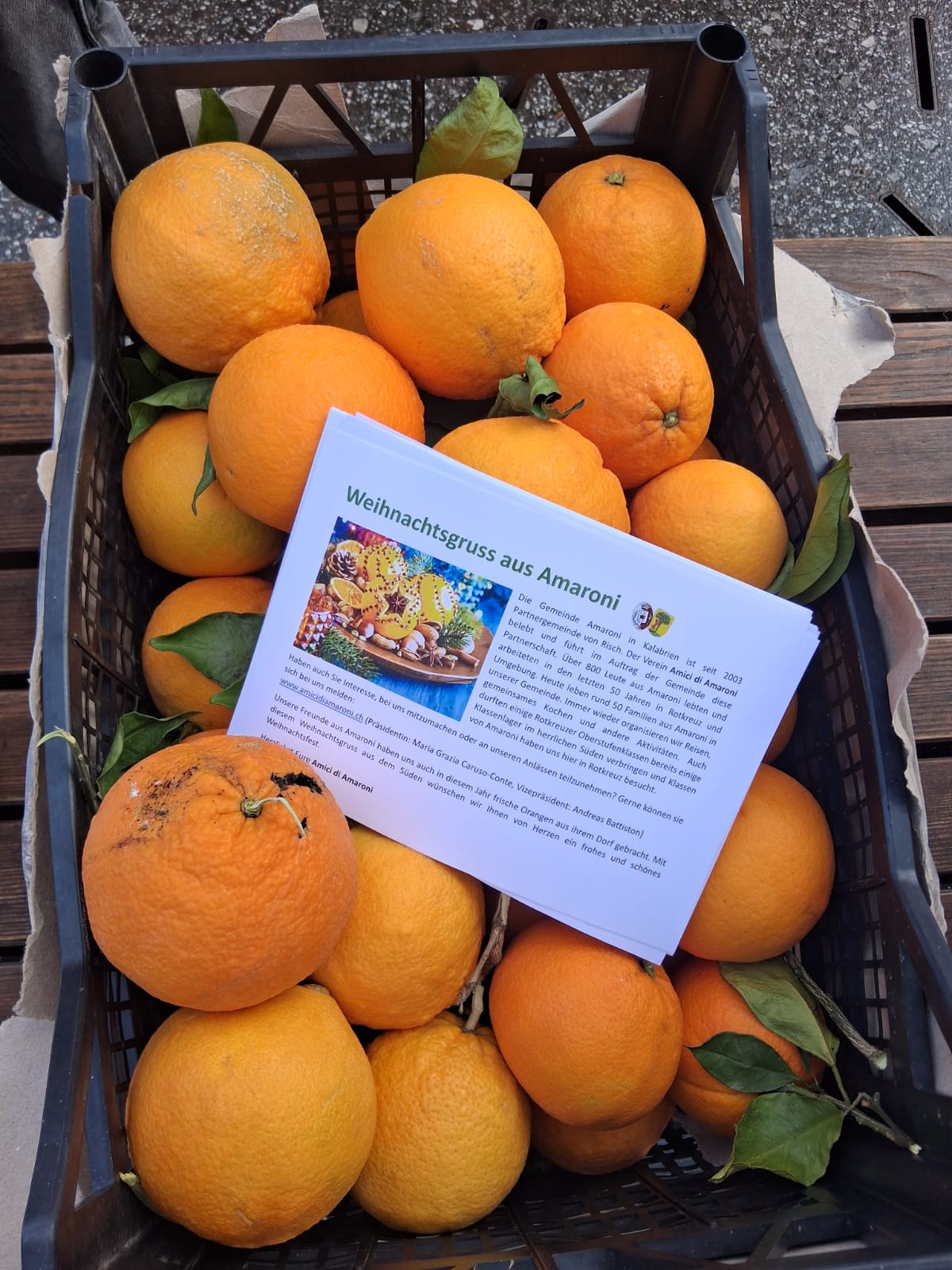 Auch in diesem Jahr durften wir wieder eine ganz besondere Überraschung aus unserer Partnergemeinde Amaroni entgegennehmen: Frische, sonnengereifte Orangen – direkt aus Süditalien! 🍊
